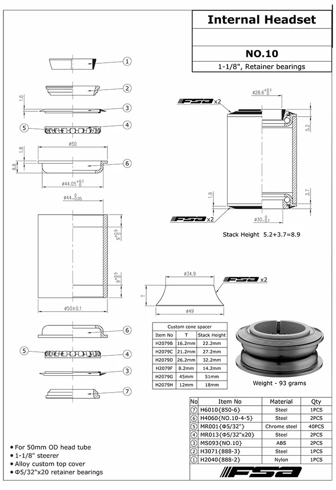 Caractéristiques du produit – Jeu de direction FSA NO.10