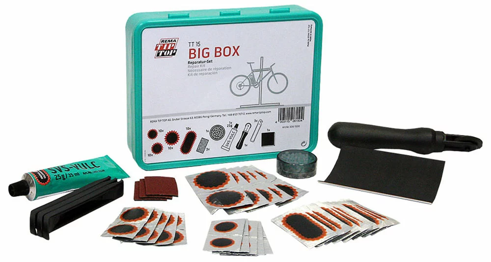 Le kit complet pour la réparation des tubes. Le Rema Tip Top TT 15 Big Box est idéal pour tous ceux qui réparent fréquemment ou beaucoup de vélos. Il a sa place dans tous les ateliers, à la maison et dans toutes les excursions à vélo du groupe.