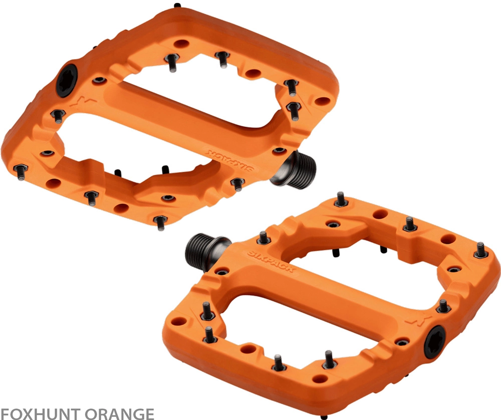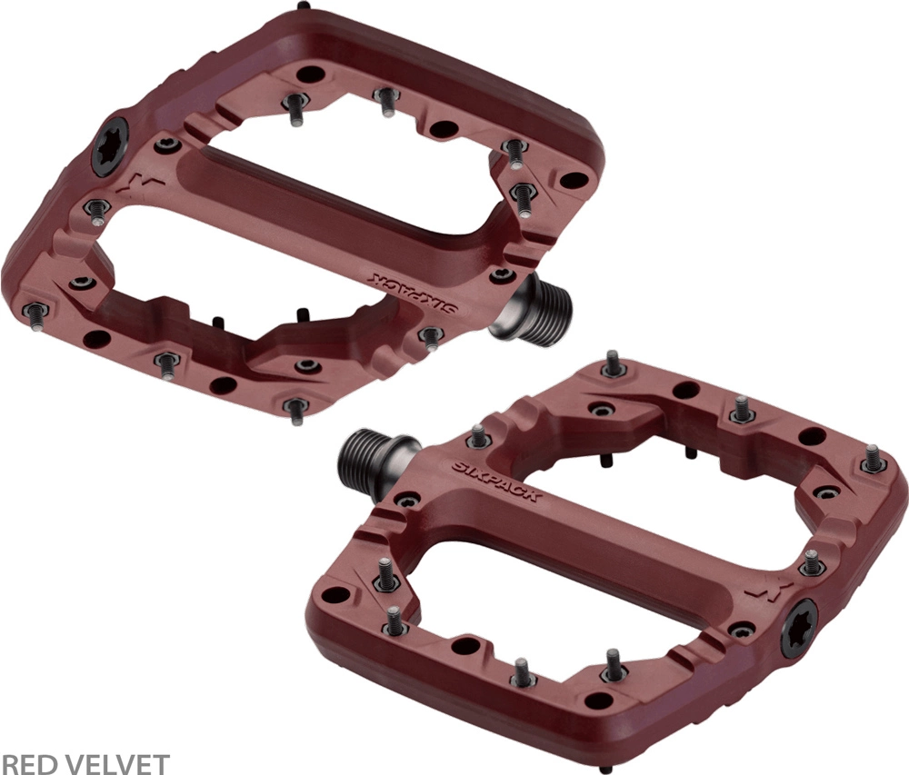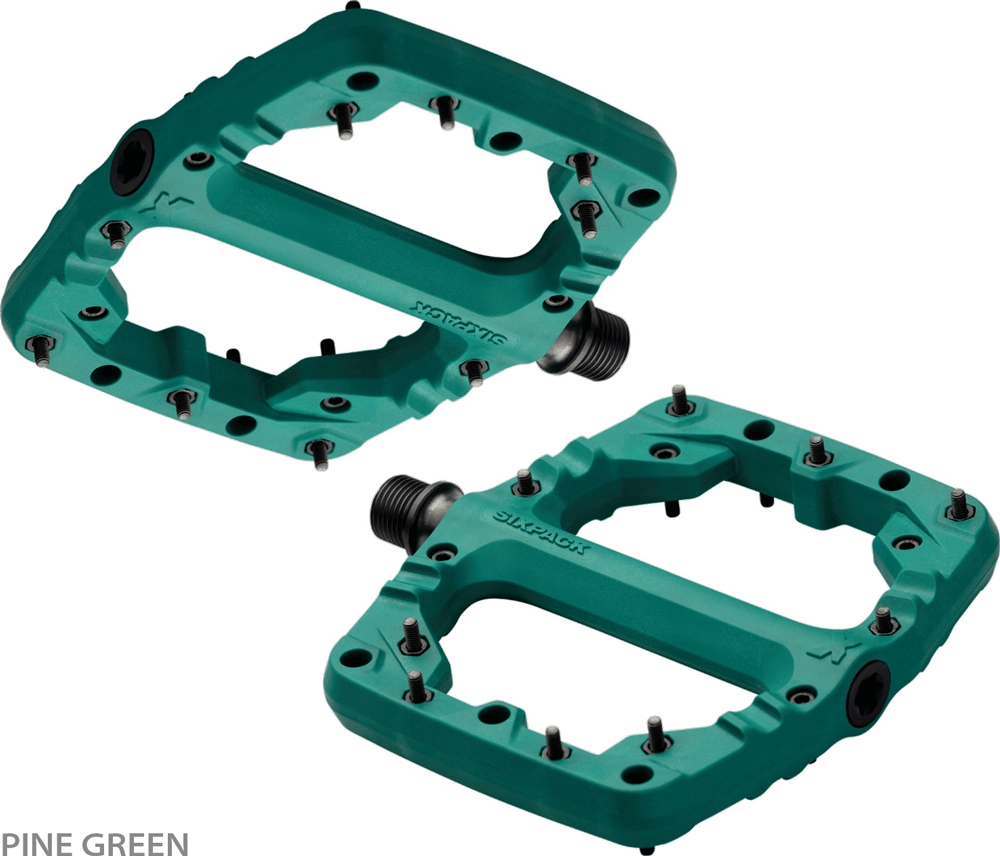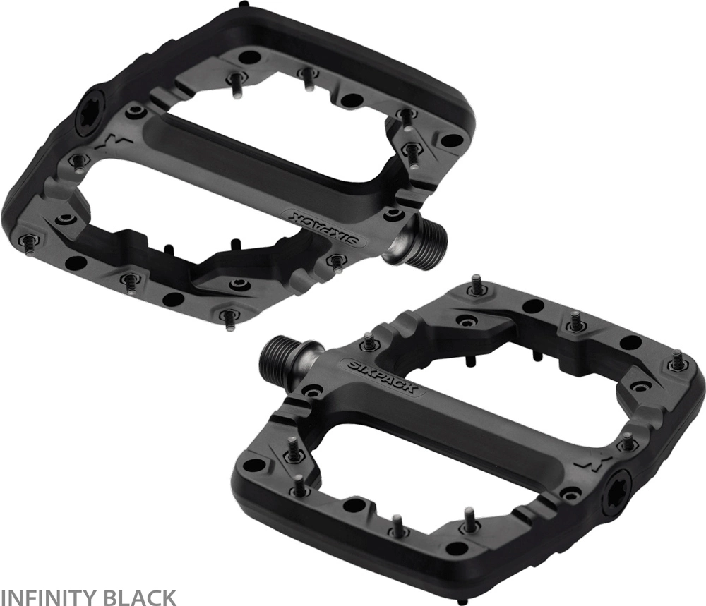 Les pédales Gravity « Kamikaze PA » de Sixpack Racing disposent d’une grande surface d’appui avec un profil préformé et 18 pins extra longs en acier. Le corps de pédale composite est fabriqué en polyamide renforcé de fibres de verre et résiste à des charges extrêmes.
